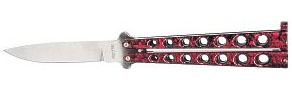 This 5 inch (closed) butterfly knife has a 440 stainless steel blade and cast metal handle. Very durable.