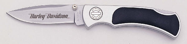 Closed Length: 3 1/2" Blade Length: 2 3/4" Blade Thickness: 1/8" Blade Material: Laser etched, 440 stainless steel, bead blasted, built-on thumbstud Handle Material: Lightweight aluminum, silver hard coat finish, black rubber inserts, nickel silver H-D shield. Model HD0017