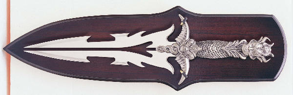 Overall Length: 17 1/4" Blade Length: 10 1/4" Blade Thickness: 1/8" Blade Material: 420 J2 stainless steel Handle Material: ABS with snakeskin texture, cast metal guard and pommel, antique silver plated finish, rat-tail tang construction. Plaque: 19 3/4" x 6 1/16" wood, woodgrain finish, includes mounting hardware, instructions. Model UC1142