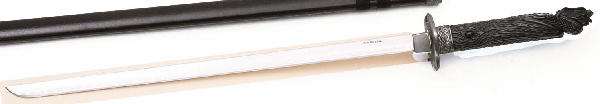 Overall Length: 35" Blade Length: 24 1/2" Blade Thickness: 3/16" Blade Material: 420 J2 stainless steel, simulated temper line Handle Material: Cast aluminum, antique finish, imitation black jewel mounted in both sides, cast metal guard, push tang (1/2 length) construction Scabbard: Aluminum, black crinkle design, cast metal throat Model UC897