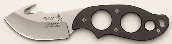 The Safari is designed for the serious hunter using precision laser-cut parts, CNC machined and ground to the closest tolerances possible in the knife industry. Features 440 stainless steel, full tang construction with 6061-T6 aircraft aluminum handle scales. Black anodized finish. The special patented handle design allows for comfortable, controlled grip while reducing hand and wrist fatigue. Includes genuine leather and nylon cordura belt sheath embossed with the Colt logo.
