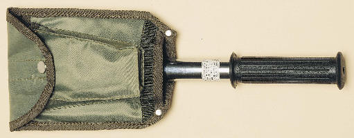 Versatile tool with interchangeable parts. Functions as wood saw, shovel, axe, bottle opener, hammer, and nail puller. Collapses to a convenient size.