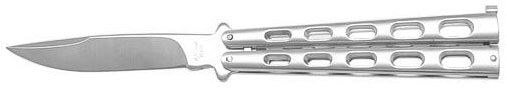 This 5 inch (closed) butterfly knife has a 440 stainless steel blade and cast metal handle. Very durable.