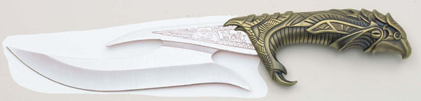 Forged with the power of Horus, the falcon headed Egyptian god of light. Features hieroglyphics engraved in the blade and an intricately detailed cast metal handle. Includes a genuine leather sheath.