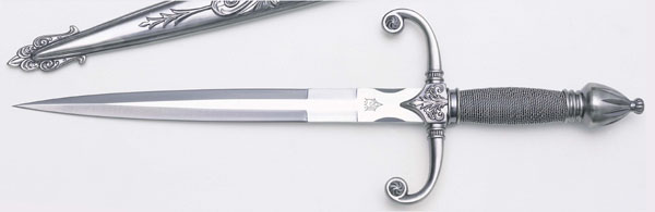 Overall Length: 16 3/8" Blade Length: 10 1/2" Blade Thickness: 3/16" Blade Material: 420 J2 stainless steel, double-edged Handle Material: Cast metal guard and pommel, antique silver plated finish, twisted wire-wrapped grip, rat-tail tang Scabbard: Cast metal, antique silver plated finish, genuine leather tie. Model UC1144