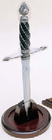 Overall Length: 12 7/8" Blade Length: 7 1/4" Blade Thickness: 3/16" Blade Material: 420 J2 stainless steel, double-edged Handle Material: Fluted ABS grip, nickel plated wire wrap, cast metal cross guard and pommel, antique pewter finish, rat-tail tang construction Display Stand: 5 3/16" x 5 3/16" x 2 3/4" wood stand, lacquered finish. Model UC969