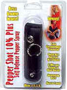 1/2 ounce with leatherette holster, locking actuator and quick key release keychain. Effective up to 8 feet. Contains 5 one second bursts. (Cannot be shipped to NY) Sorry, no International orders or express shipping for pepper spray. Model PS-1