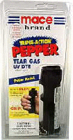 Triple Action Mace sprays combines OC PEPPER with CN TEAR GAS along with a UV MARKING DYE. OC PEPPER causes eyes to slam shut and uncontrollable coughing and choking. CN TEAR GAS causes profuse tearing, an intense burning sensation to the face, and disorientation. UV DYE marks the assailant and may aid in identification once apprehended. Same size model used by law enforcement personnel. Velcro-like attachment allows for convenient storage. Features flip-top safety cap. 18 gram unit sprays 6-12 feet. Contains 10 one second bursts. (Cannot be shipped to NY) Sorry, no International orders or express shipping for pepper spray. Model 80112